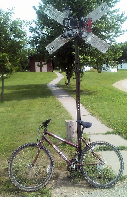 Driving down to Peru (a town with 500 people but that is home to one of Nebraska’s three state colleges), I met Jerry, from whom I was borrowing the bike, at the trailhead (or car park as we would call it). “We used to have 11 bikes, mostly picked up in yard sales for a dollar or two”. No kidding. If I thought that my Katy Trail bike was towards the basic end, this one made that look like a Chris Boardman designed record breaker. Sure, this bike had more gears – or would have done if the gear shift system had worked. As it was it had “some” gears. The saddle kept tilting back every time I hit a bump – and there were many bumps, so I ended up in a sort of Easy Rider position. Which frankly is all well and good on a Harley, but less so on a steel framed mountain bike. Anyway, it was free – so I really mustn’t complain.