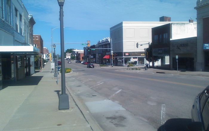 This alteration also explains why L&C didn’t mention the cave. They definitely camped in this area, but the the overhanging rock that gives the park its name was more than a mile from the river back then. Today it’s less than 100 metres and has been rather ruined by a boardwalk, steps, and fence, which I guess hinders people from making their own ‘engravings’ alongside the original 1200-year-old petroglyphs. There are identifiable bison and a few other animal shapes. The cave offered shelter and was also believed to have been used as a gathering place. Next stop Nebraska City (pictured here in the evening rush hour).