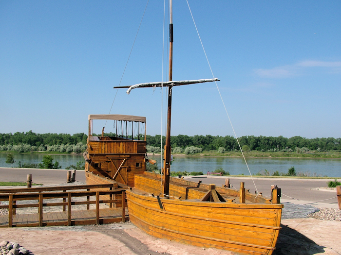 After all the rain, the blue skies of a Tuesday morning in Bismarck were quite the treat. I took the River Road (of course), destination Fort Mandan – an extremely significant location on the Lewis & Clark Trail. I didn’t know about Keelboat Park on the edge of Bismarck. It was home to another replica keelboat and some bizarre statues of who I presume are Lewis, Clark and Sacajawea although there’s no plaque identifying the artist or subjects of this bit of colourful if rather basic sculpture.